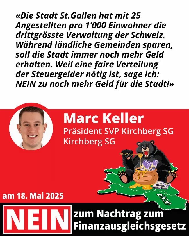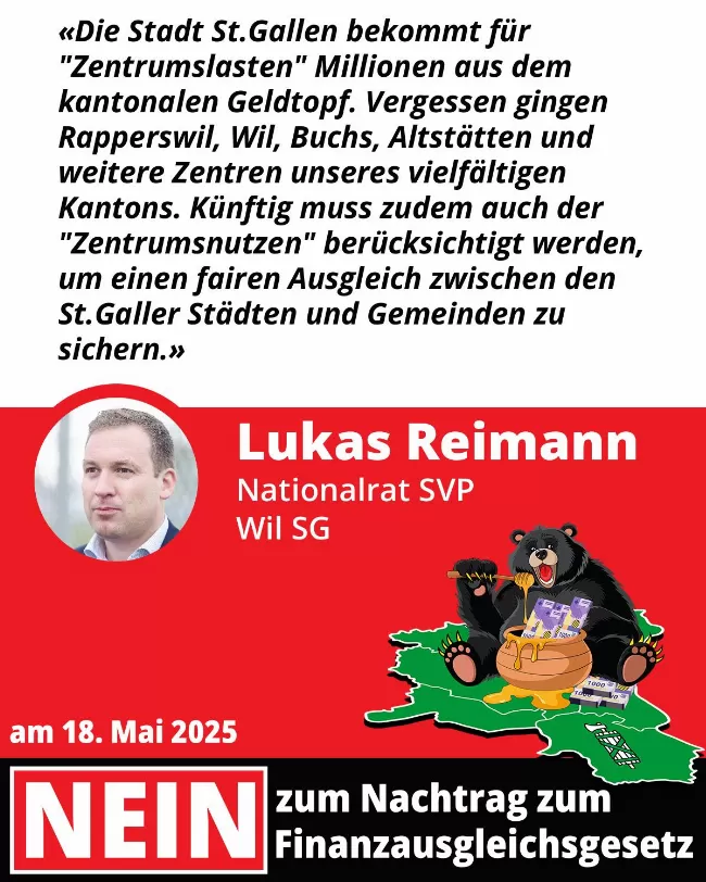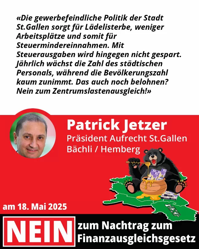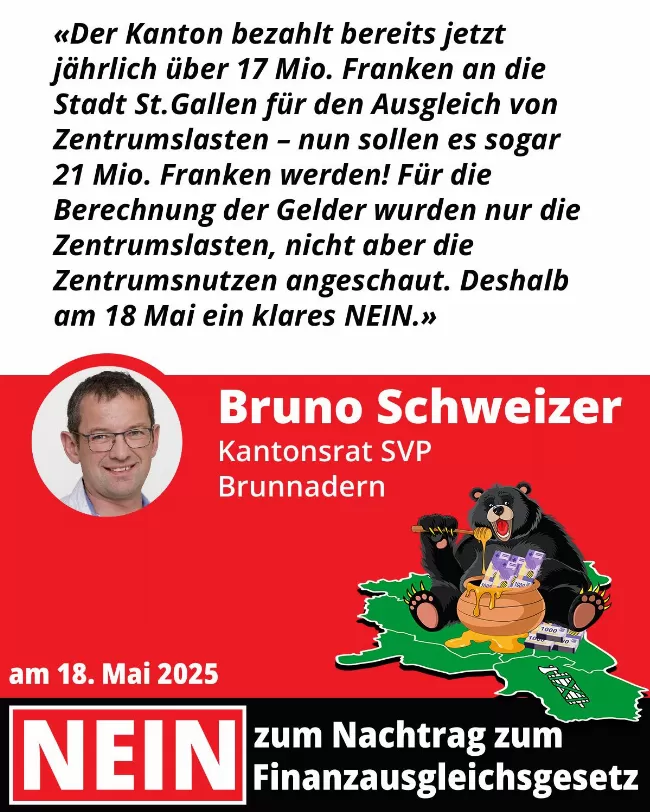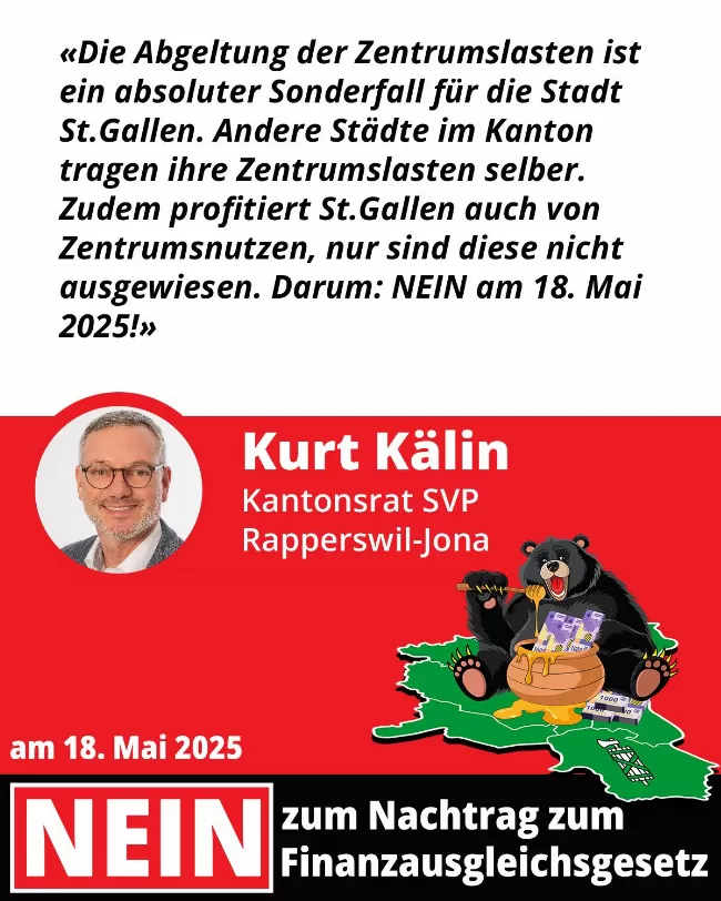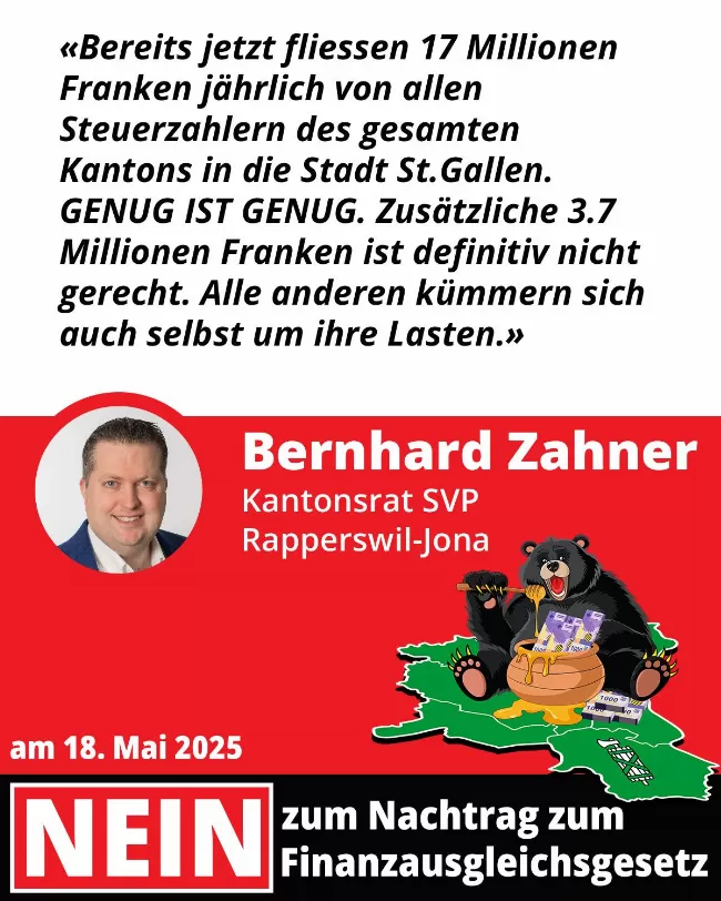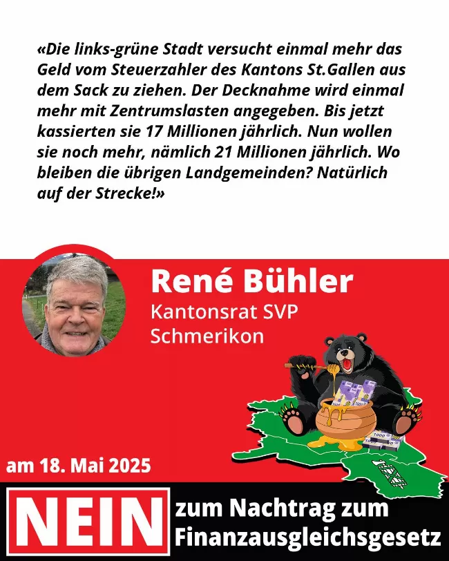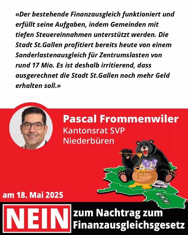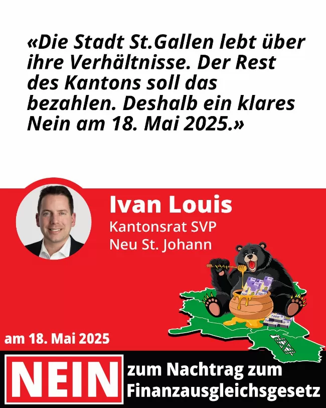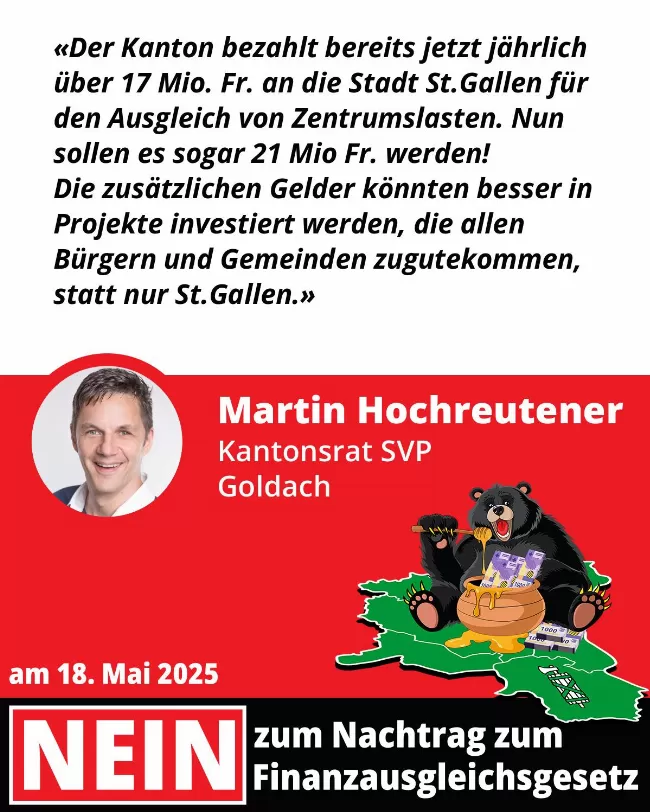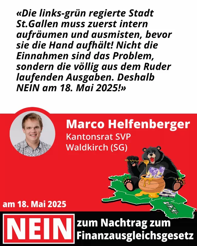 Am 18. Mai 2025 stimmt der Kanton St.Gallen über den V. Nachtrag zum Finanz-ausgleichsgesetz ab. Die Stadt St.Gallen erhält bereits heute mehr als 17 Mio. Franken aus dem kantonalen Finanzausgleich für Zentrumslasten. nun sollen es über 21 Mio. Franken auf Kosten aller Steuerzahlerinnen und Steuerzahler im Kanton St.Gallen werden. Ein überparteiliches Komitee aus Mitgliedern der SVP, EDU, Die Mitte, FDP sowie diversen Parteilosen präsentierte am Donnerstag, 3. April 2025, die geplante Kampagne.