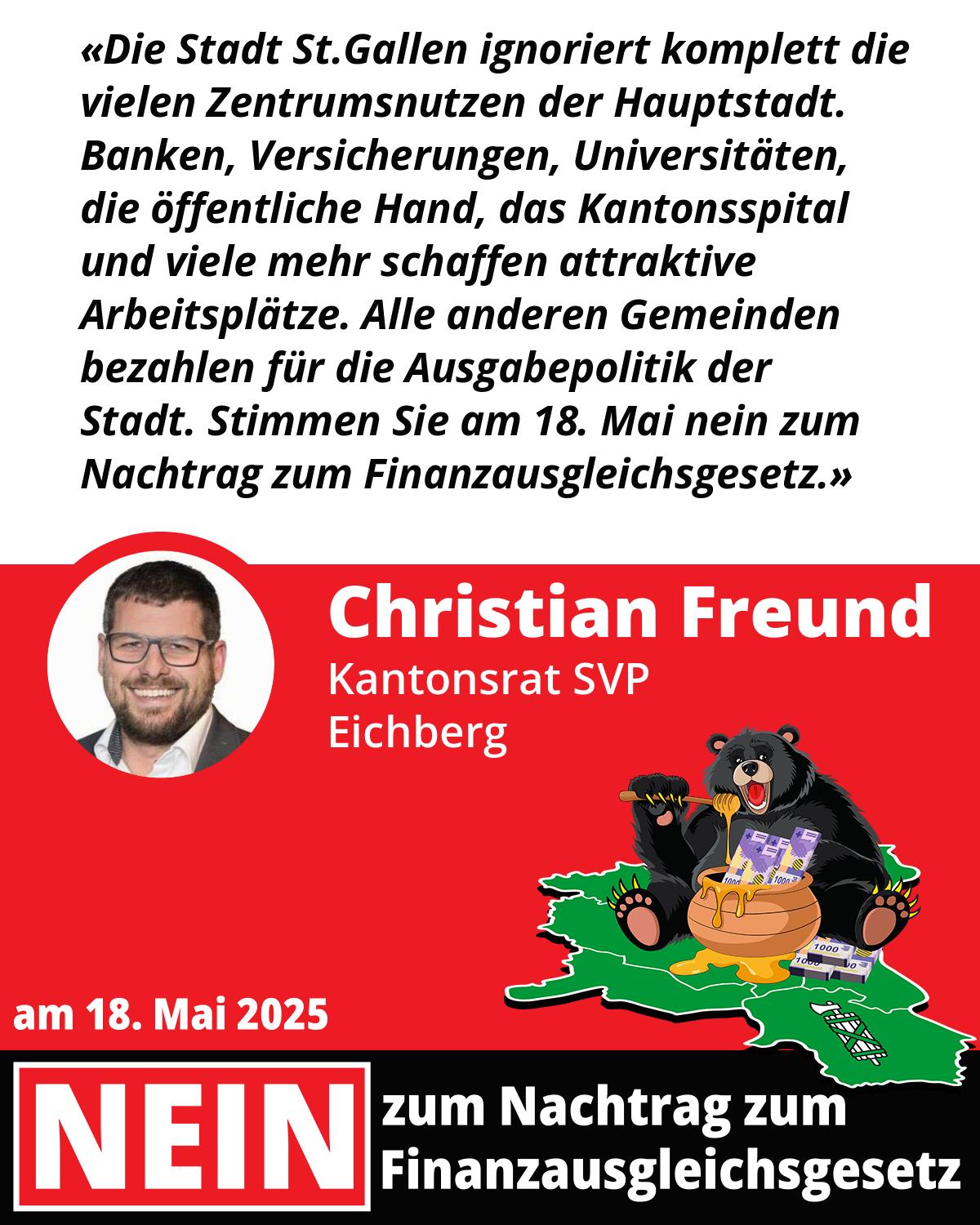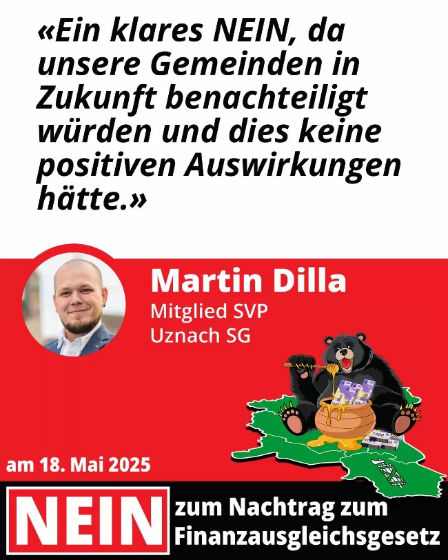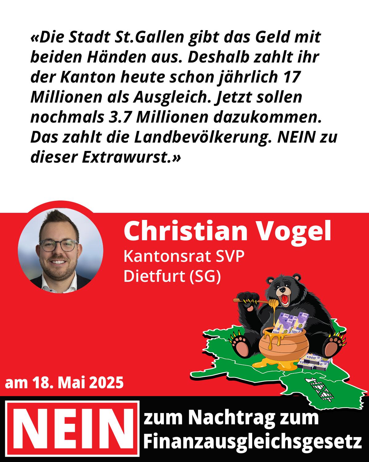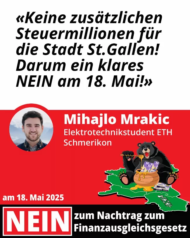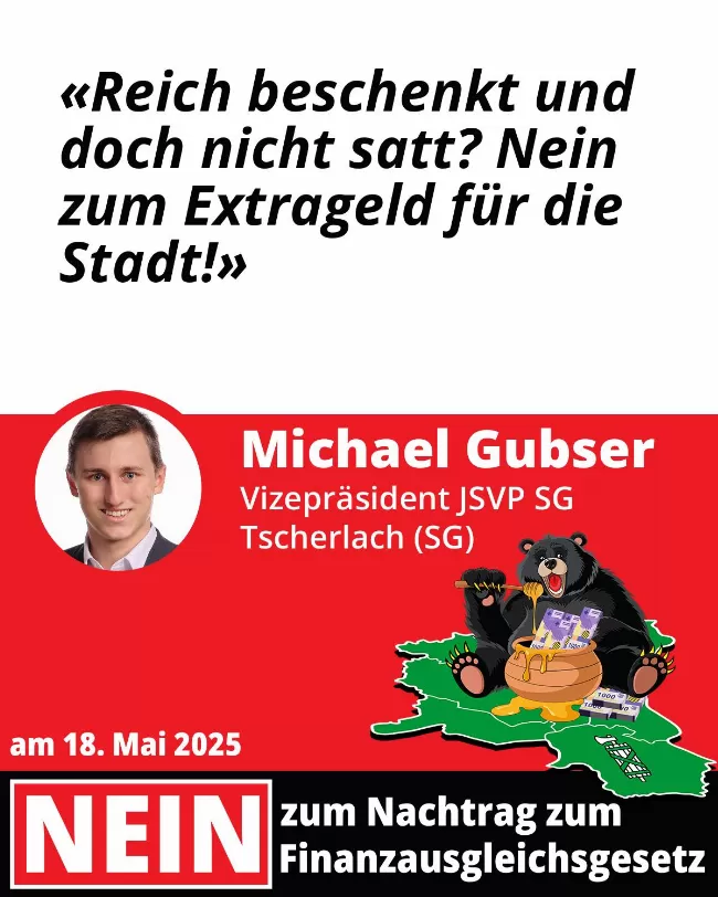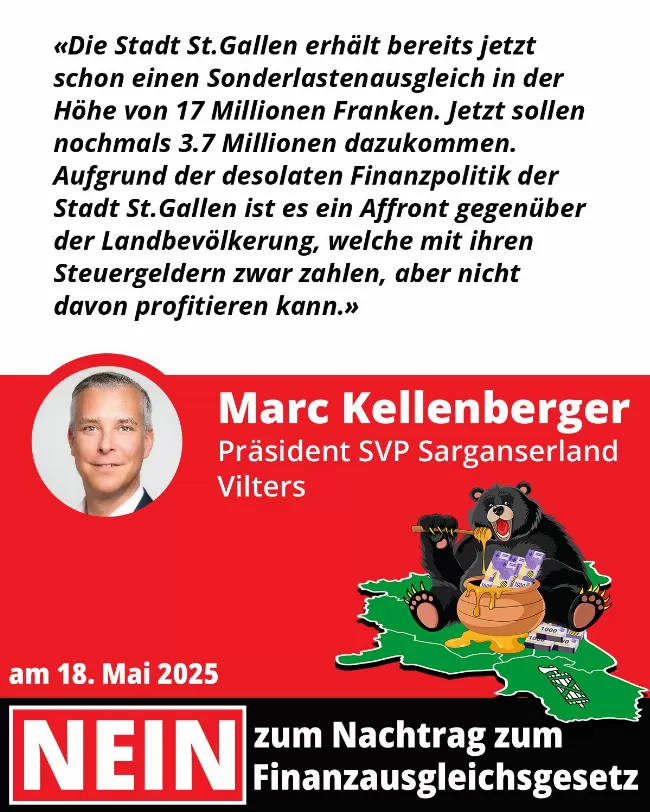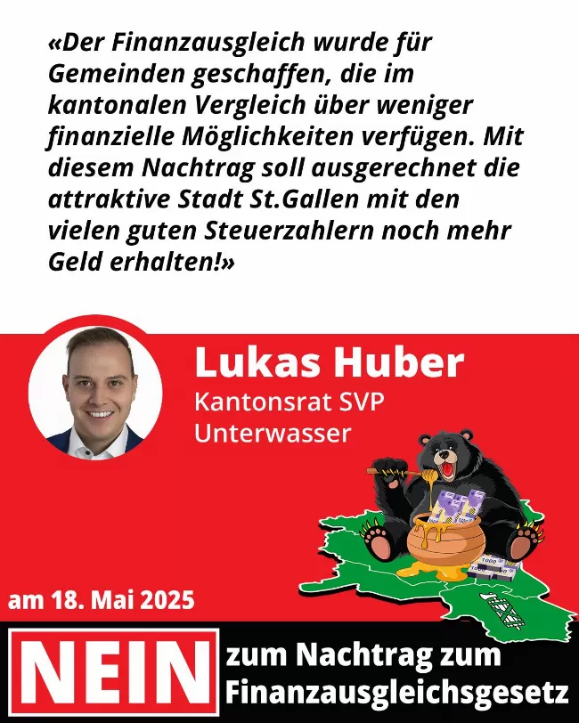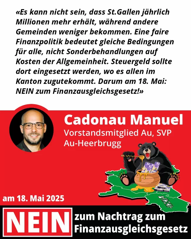 Am 18. Mai 2025 stimmt der Kanton St.Gallen über den V. Nachtrag zum Finanz-ausgleichsgesetz ab. Die Stadt St.Gallen erhält bereits heute mehr als 17 Mio. Franken aus dem kantonalen Finanzausgleich für Zentrumslasten. nun sollen es über 21 Mio. Franken auf Kosten aller Steuerzahlerinnen und Steuerzahler im Kanton St.Gallen werden. Ein überparteiliches Komitee aus Mitgliedern der SVP, EDU, Die Mitte, FDP sowie diversen Parteilosen präsentierte am Donnerstag, 3. April 2025, die geplante Kampagne.