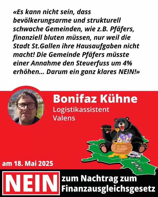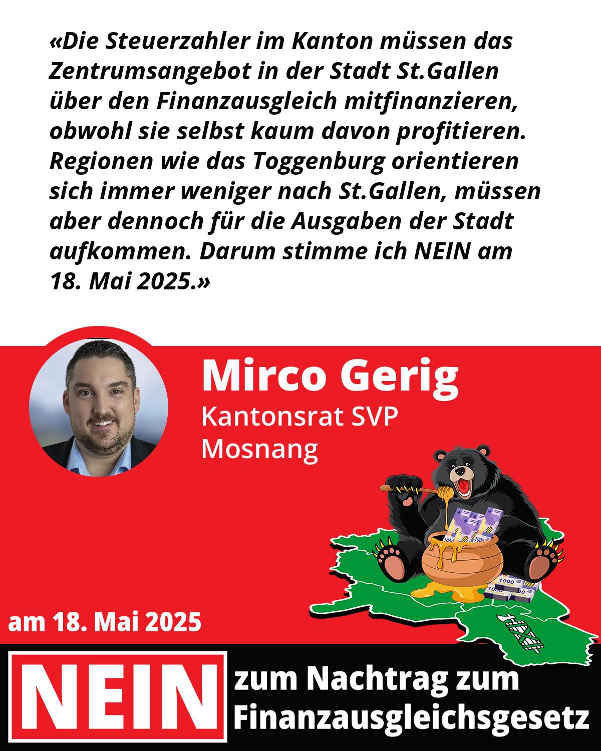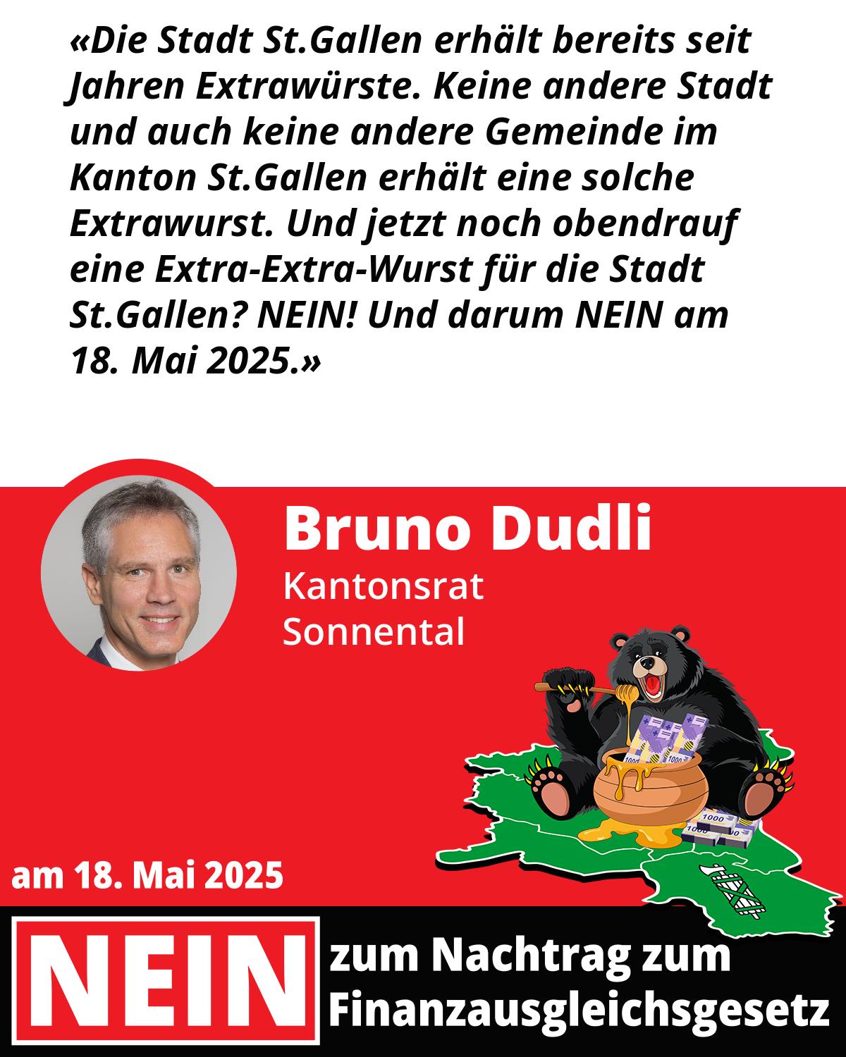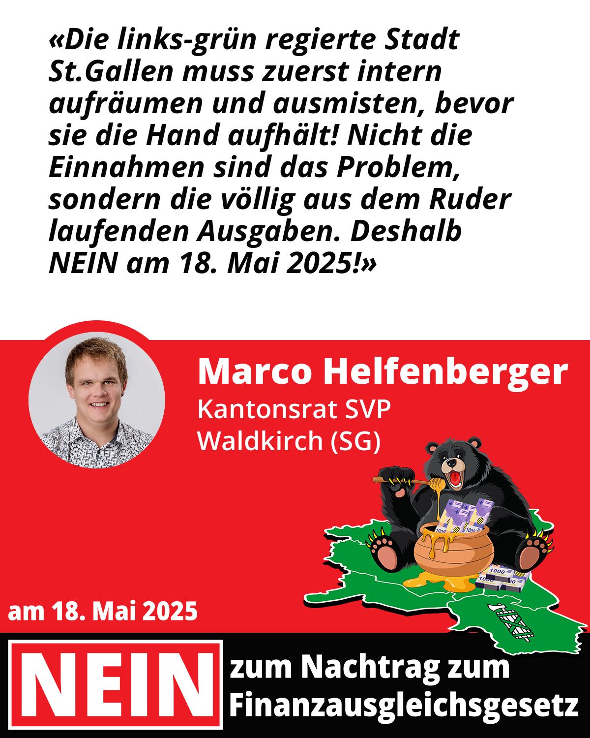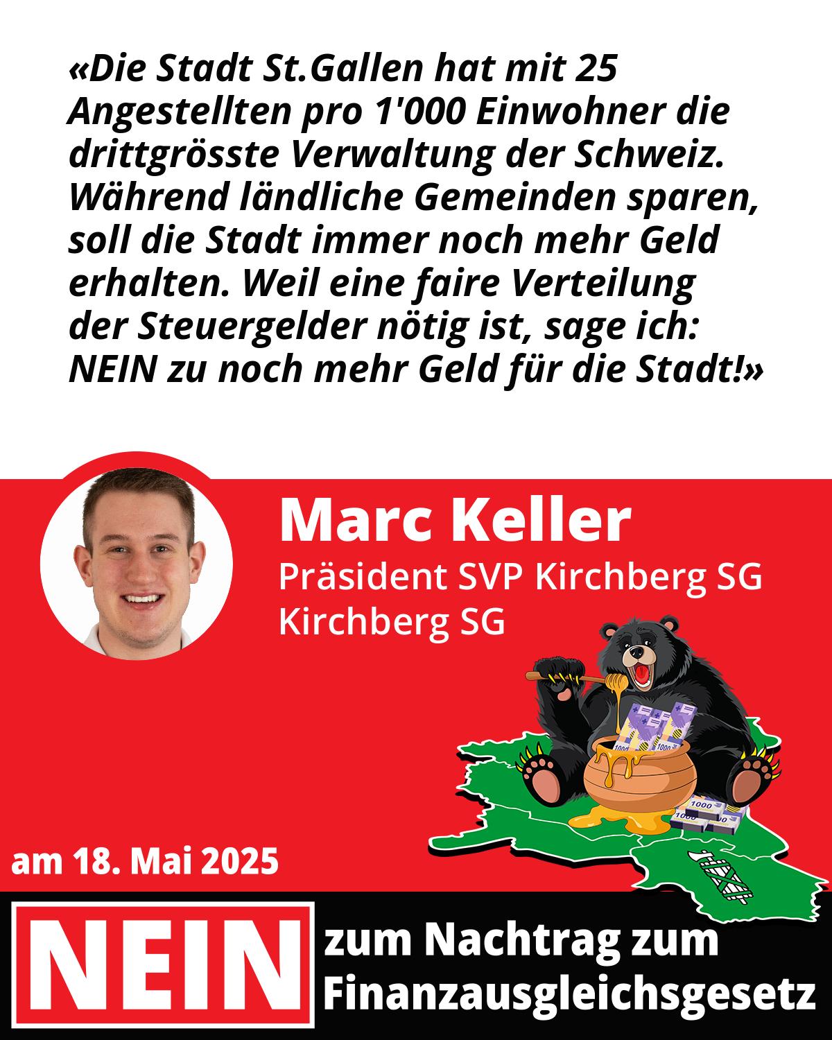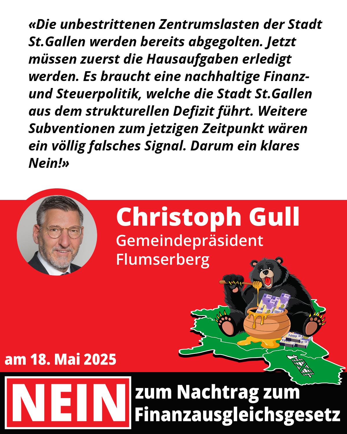 Am 18. Mai 2025 stimmt der Kanton St.Gallen über den V. Nachtrag zum Finanz-ausgleichsgesetz ab. Die Stadt St.Gallen erhält bereits heute mehr als 17 Mio. Franken aus dem kantonalen Finanzausgleich für Zentrumslasten. nun sollen es über 21 Mio. Franken auf Kosten aller Steuerzahlerinnen und Steuerzahler im Kanton St.Gallen werden. Ein überparteiliches Komitee aus Mitgliedern der SVP, EDU, Die Mitte, FDP sowie diversen Parteilosen präsentierte am Donnerstag, 3. April 2025, die geplante Kampagne.