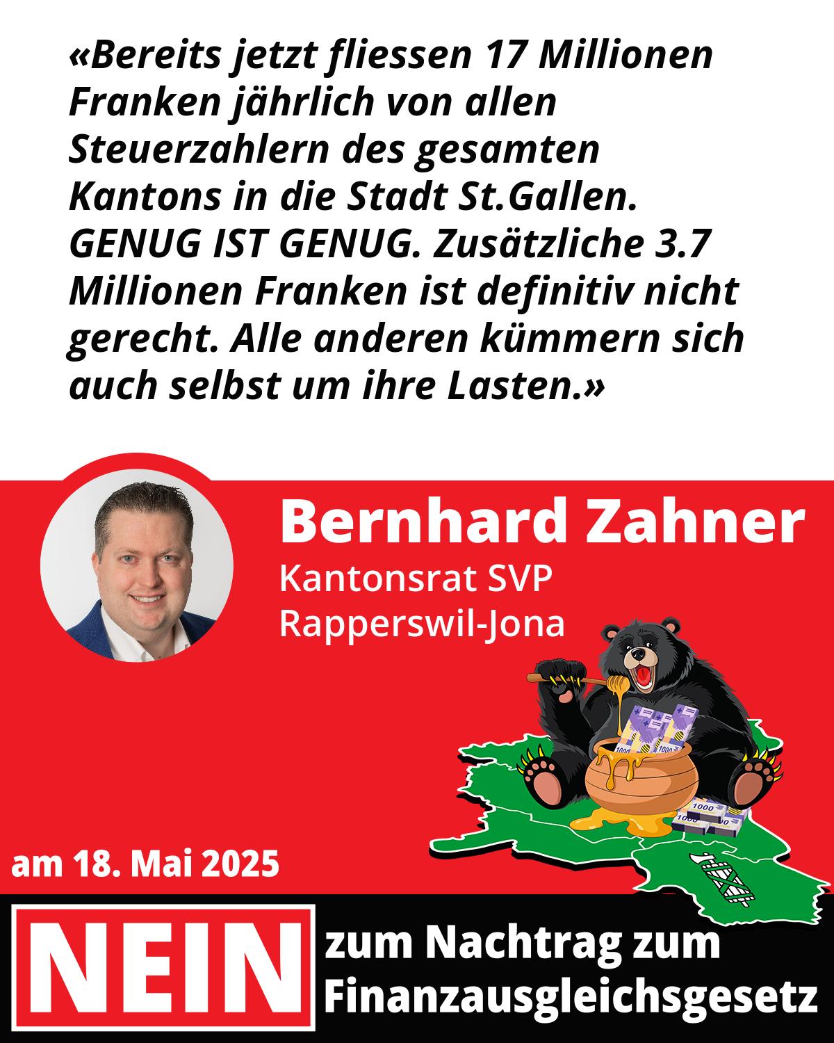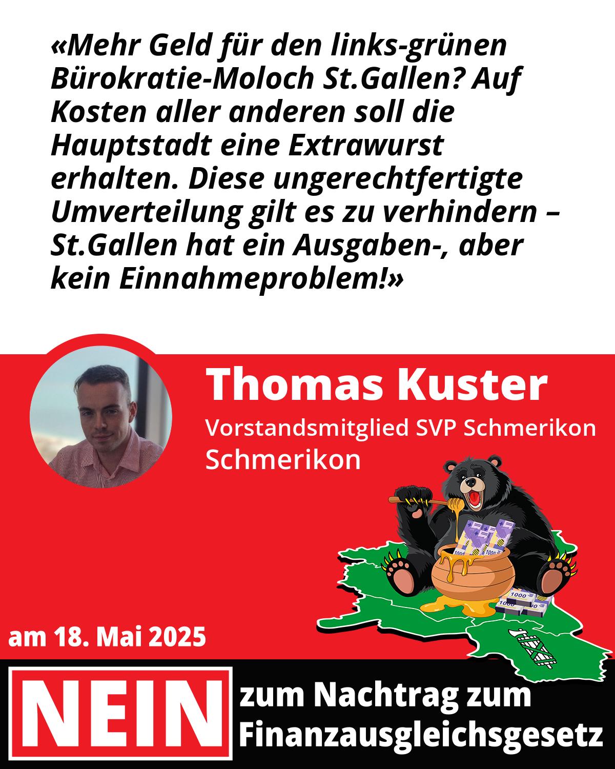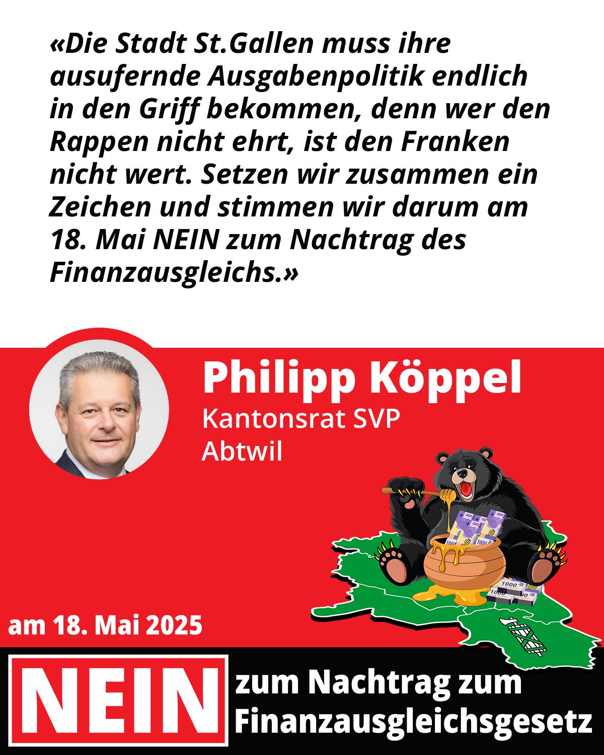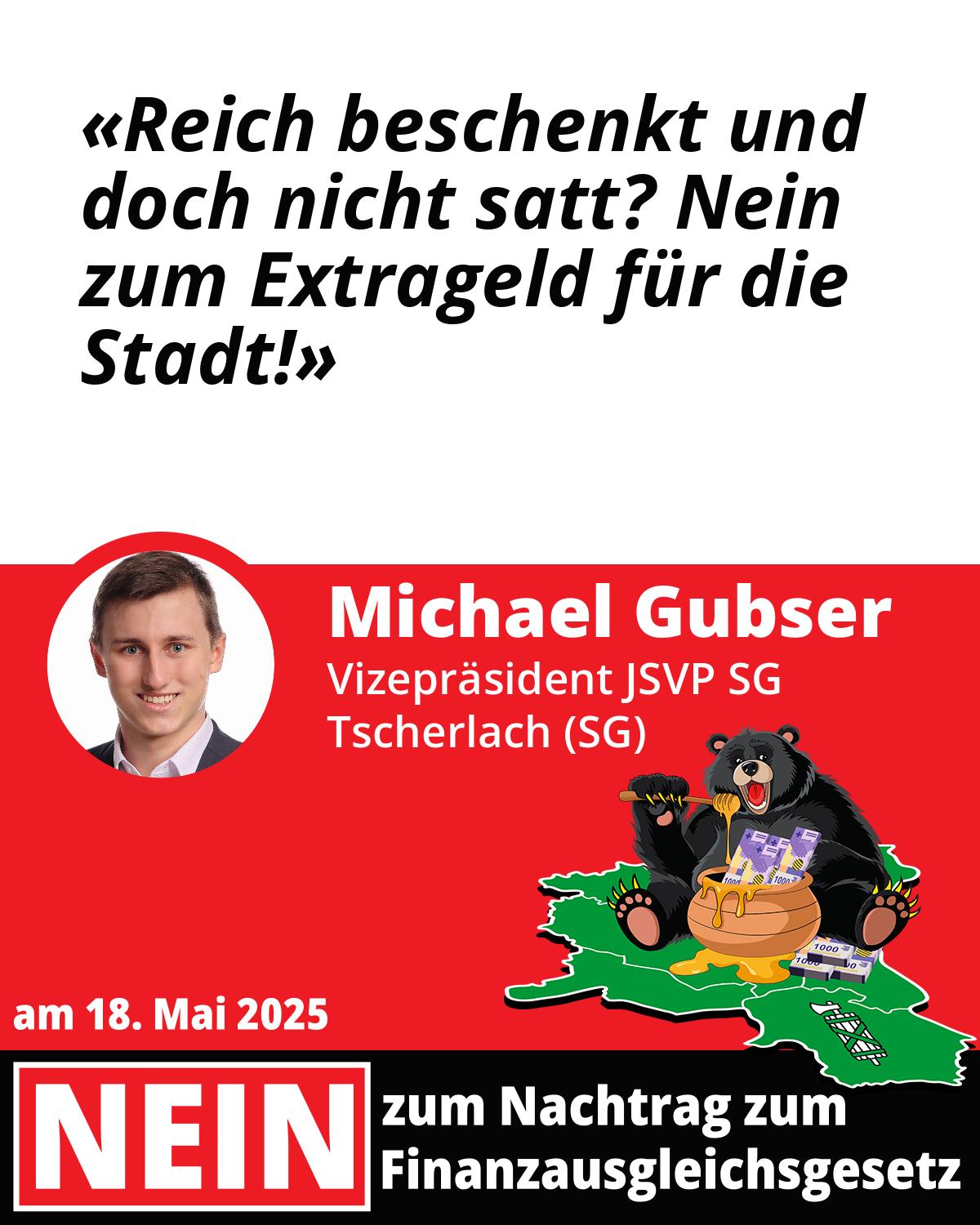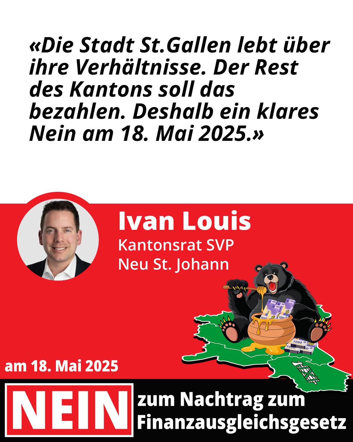 Am 18. Mai 2025 stimmt der Kanton St.Gallen über den V. Nachtrag zum Finanz-ausgleichsgesetz ab. Die Stadt St.Gallen erhält bereits heute mehr als 17 Mio. Franken aus dem kantonalen Finanzausgleich für Zentrumslasten. nun sollen es über 21 Mio. Franken auf Kosten aller Steuerzahlerinnen und Steuerzahler im Kanton St.Gallen werden. Ein überparteiliches Komitee aus Mitgliedern der SVP, EDU, Die Mitte, FDP sowie diversen Parteilosen präsentierte am Donnerstag, 3. April 2025, die geplante Kampagne.
