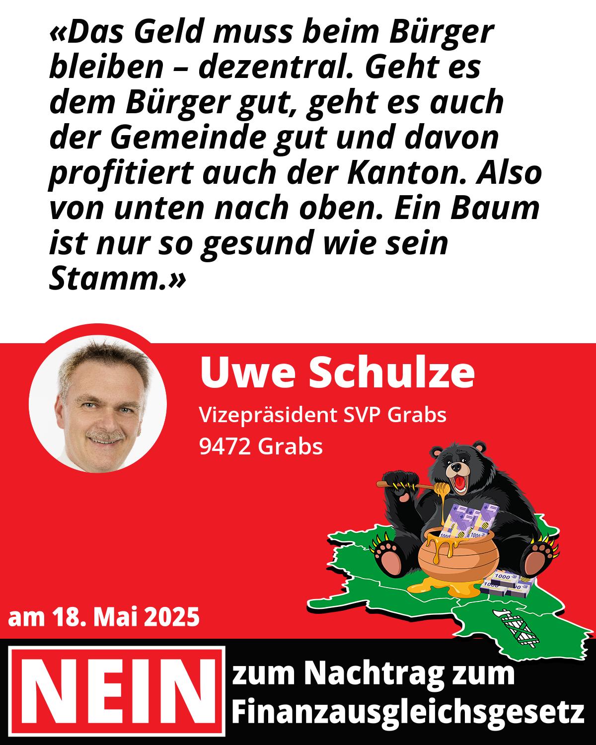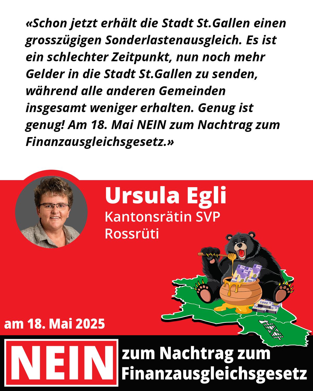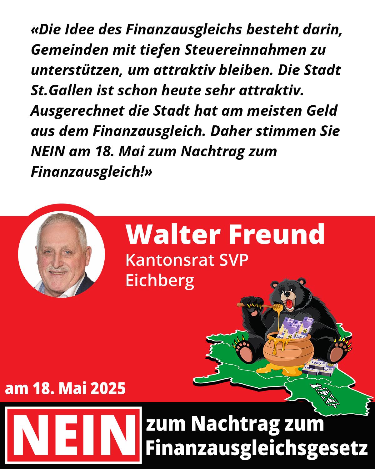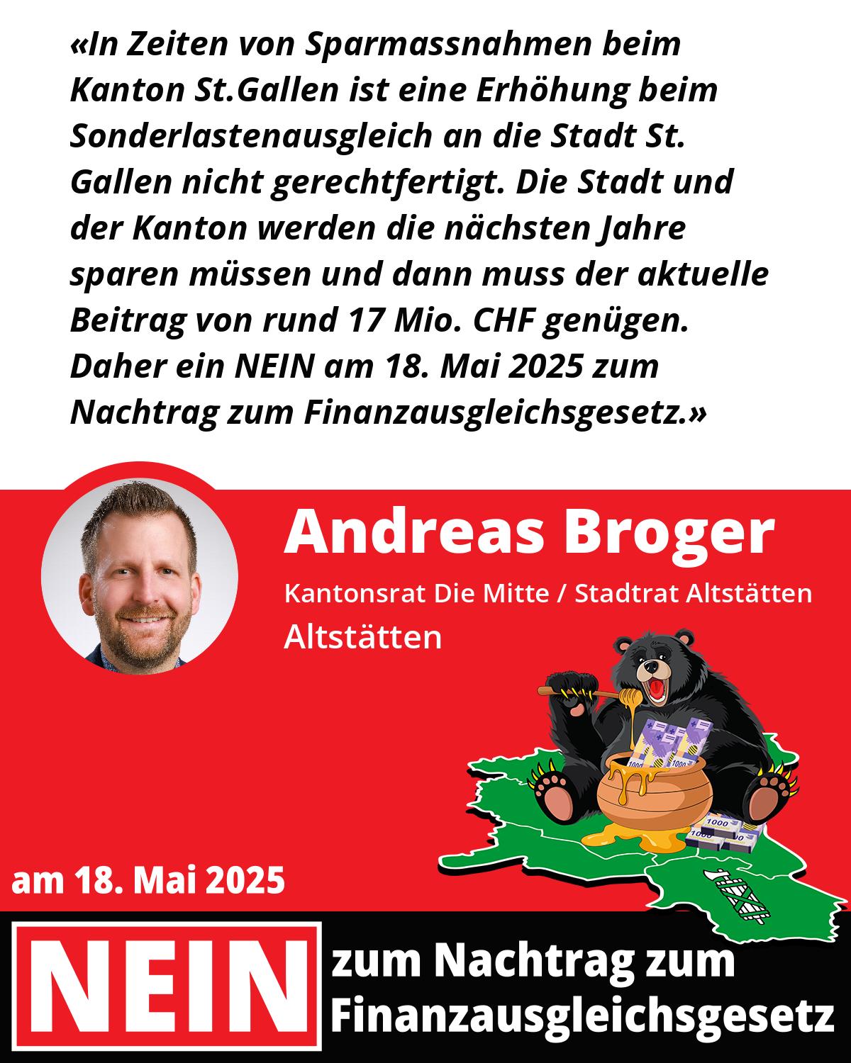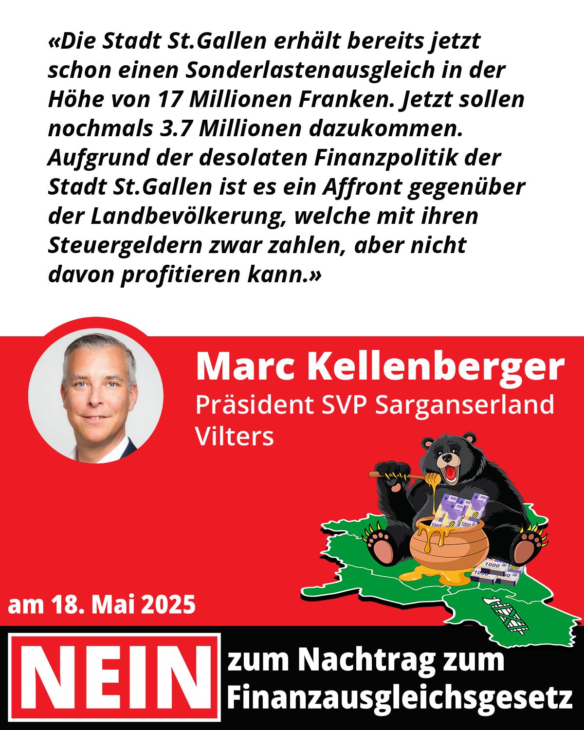 Am 18. Mai 2025 stimmt der Kanton St.Gallen über den V. Nachtrag zum Finanz-ausgleichsgesetz ab. Die Stadt St.Gallen erhält bereits heute mehr als 17 Mio. Franken aus dem kantonalen Finanzausgleich für Zentrumslasten. nun sollen es über 21 Mio. Franken auf Kosten aller Steuerzahlerinnen und Steuerzahler im Kanton St.Gallen werden. Ein überparteiliches Komitee aus Mitgliedern der SVP, EDU, Die Mitte, FDP sowie diversen Parteilosen präsentierte am Donnerstag, 3. April 2025, die geplante Kampagne.