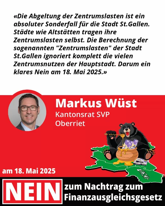 - Der Kanton bezahlt bereits jetzt jährlich über 17 Mio. an die Stadt St.Gallen für den Ausgleich von Zentrumslasten – nun sollen es sogar 21 Mio. werden! Die zusätzlichen Gelder könnten besser in Projekte investiert werden, die allen Bürgern und Gemeinden zugutekommen, statt nur St.Gallen.